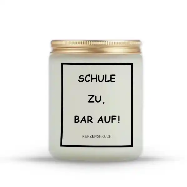 Wenn du Duftkerzen kaufen möchtest, findest du hier die perfekte Idee für den großen Tag. Das Zitat „SCHULE ZU, BAR AUF!“ bringt die ausgelassene Stimmung zum Ausdruck, mit der der Abschluss gefeiert wird.