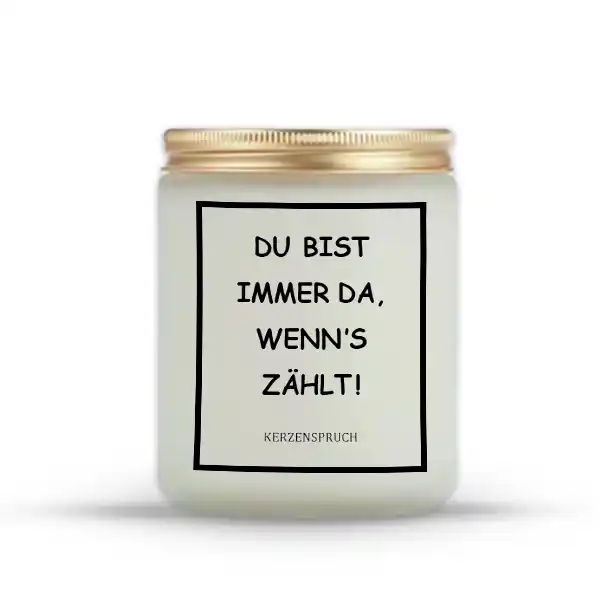 Mit diueser Kerze verschenkst du Wärme und Vertrauen. Das Zitat „DU BIST IMMER DA, WENN’S ZÄHLT!“ macht deine Gabe zu einem Ausdruck echter Verbundenheit. Bestelle jetzt und zeige, wie sehr dir jemand wichtig ist.