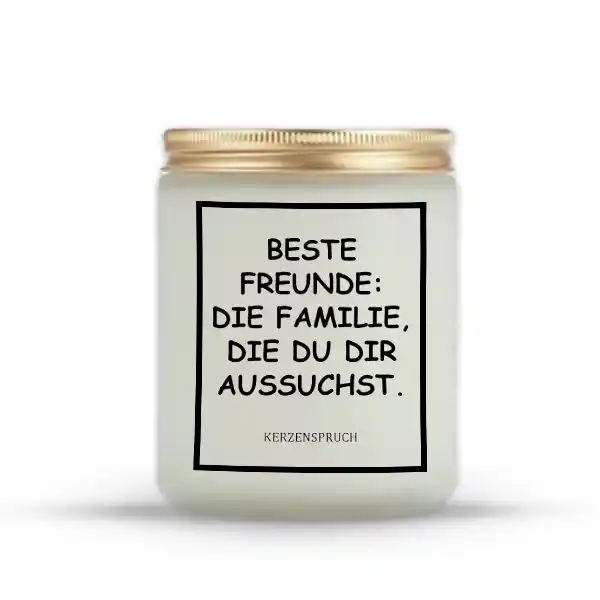 Mit dem Spruch „BESTE FREUNDE: DIE FAMILIE, DIE DU DIR AUSSUCHST.“ schenkst du dir und deinen Liebsten ein Symbol für Nähe und Zusammenhalt. Diese Duftkerze ist mehr als nur ein Accessoire – sie bringt Wertschätzung und Wärme in jeden Raum und erinnert daran, wie wichtig echte Freundschaften sind.