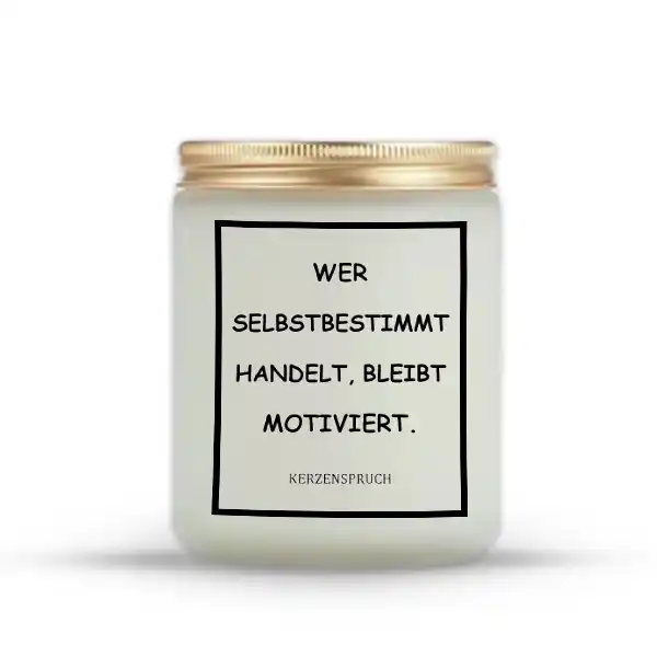 Duftkerzen mit Zitat sind mehr als nur ein hübsches Accessoire – sie bringen Atmosphäre und Motivation in dein Zuhause. Der Spruch „WER SELBSTBESTIMMT HANDELT, BLEIBT MOTIVIERT.“ erinnert daran, wie wichtig es ist, das eigene Leben bewusst zu gestalten und Verantwortung für die eigenen Entscheidungen zu übernehmen.