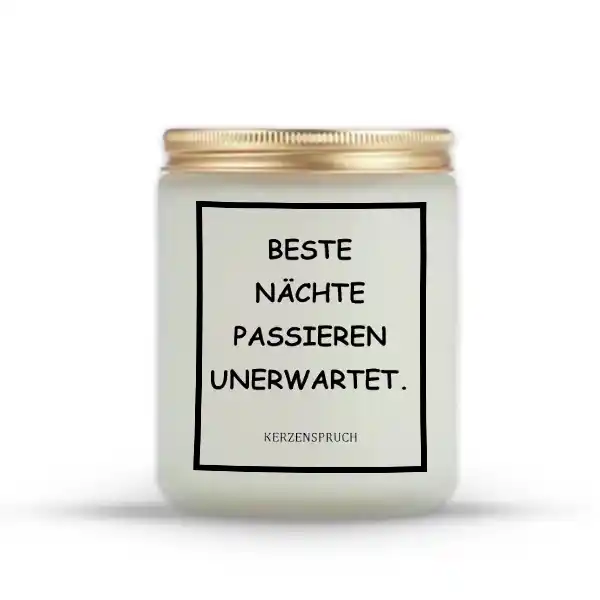 Der Spruch „BESTE NÄCHTE PASSIEREN UNERWARTET.“ auf dem Etikett sagt alles: Manchmal braucht es nicht viel – nur das richtige Licht, den passenden Duft und ein kleines Stück Zeit, um den Moment zu genießen.
