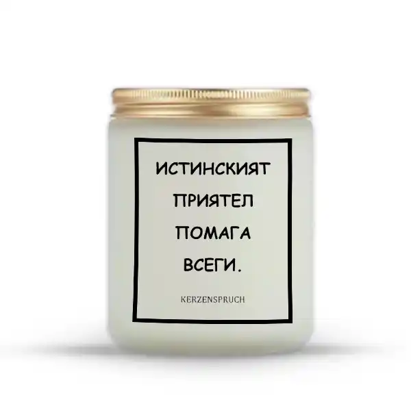 Sichere dir deine Kerze mit dem frischen Duft „Meeresgold“ und dem tiefgründigen Spruch „ИСТИНСКИЯТ ПРИЯТЕЛ ПОМАГА ВСЕГИ.“. Hol dir ein Stück Freundschaft, das leuchtet und duftet – für Momente, die wirklich zählen.