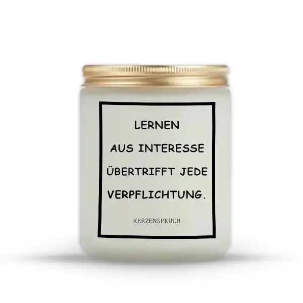 Unsere Kerzen für ein tolles Geschenk stehen für Wertschätzung und Aufmerksamkeit. Sie sind ein Symbol für Wärme und Verbundenheit, das in jedem Raum positive Energie verbreitet. Das Zitat „LERNEN AUS INTERESSE ÜBERTRIFFT JEDE VERPFLICHTUNG.“ verleiht der Kerze eine inspirierende Botschaft, die den Beschenkten auf seinem Lebensweg begleitet und motiviert, neue Wege zu gehen und offen für Neues zu bleiben.