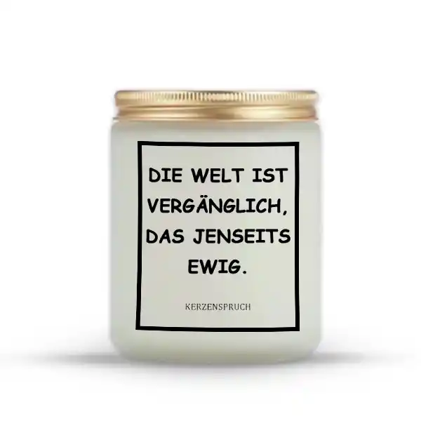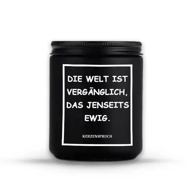 Der prägnante Spruch „DIE WELT IST VERGÄNGLICH, DAS JENSEITS EWIG.“ macht diese Kerze zu einem symbolträchtigen Begleiter, der dich an den Kern des Glaubens erinnert. Sie regt zum Innehalten an und schafft eine Atmosphäre, in der Respekt und Andacht Platz finden.