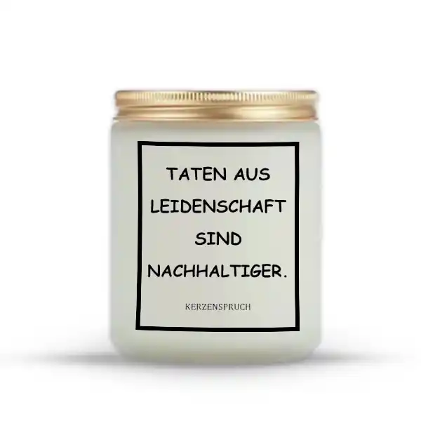 Schenke etwas, das mehr bedeutet als nur einen Gegenstand. Die Kerzen kaufen pure Romantik mit dem Zitat „TATEN AUS LEIDENSCHAFT SIND NACHHALTIGER.“ sind eine wertvolle Geste für diejenigen, die ihre Beziehung pflegen und vertiefen wollen. Diese Kerze bringt nicht nur Wärme in den Raum, sondern auch Liebe und Leidenschaft. Sie ist ein ideales Geschenk für Hochzeiten, Jahrestage oder einfach, um einem besonderen Menschen deine Gefühle zu zeigen. Die Kombination aus Kerzenlicht und einer tiefgründigen Botschaft macht diese Kerze zu einem einzigartigen Geschenk.
