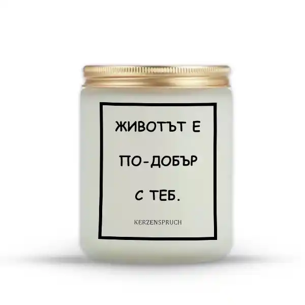 Mit dem Fokus auf Kerzen Label Design auf Bulgarisch erhältst du besondere Kerzen, die nicht nur mit ihrem warmen Licht, sondern auch mit einer tiefgründigen Botschaft überzeugen. Der Spruch „ЖИВОТЪТ Е ПО-ДОБЪР С ТЕБ.“ – „Das Leben ist besser mit dir.“ – macht diese Kerzen zu einem emotionalen Highlight, das Gefühle auf einzigartige Weise ausdrückt.