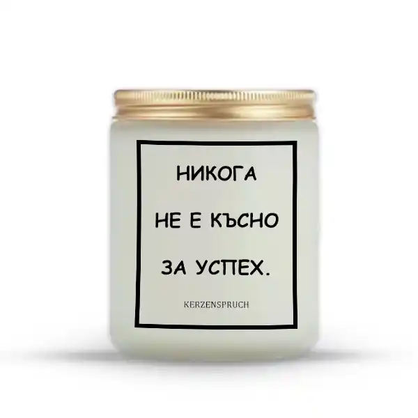 Mit einer Kerze mit bulgarischem Design holst du dir nicht nur einen schönen Blickfang, sondern auch eine tägliche Motivation. Das Zitat „НИКОГА НЕ Е КЪСНО ЗА УСПЕХ.“ begleitet dich in jedem Moment und schenkt dir Kraft für deine Ziele. Bestelle jetzt und bring kulturelle Eleganz und positive Energie in dein Leben.