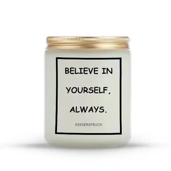 🕯️ Kerzen mit englischen Quotes sind kleine Lichtquellen mit großer Wirkung. Sie spenden nicht nur warmes Licht und angenehme Düfte, sondern tragen auch kraftvolle Botschaften, die den Alltag bereichern. Der inspirierende Spruch „BELIEVE IN YOURSELF, ALWAYS.“ erinnert auf stilvolle Weise daran, dass Selbstvertrauen der Schlüssel zu innerer Stärke ist – Tag für Tag.