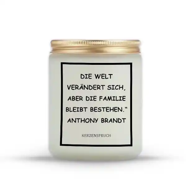Die Aussage „DIE WELT VERÄNDERT SICH, ABER DIE FAMILIE BLEIBT BESTEHEN.“ – ANTHONY BRANDT unterstreicht die Kraft familiärer Bindungen. Diese Kerze ist ideal für Anlässe wie Geburtstage, Einzüge oder einfach als Zeichen des Zusammenhalts. Sie erinnert daran, was im Leben wirklich zählt: Nähe, Vertrauen und ein liebevoller Rückhalt.