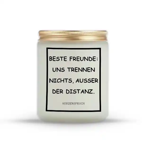 Die Kerzenspruch Duftkerzen sind mehr als nur Lichtspender – sie sind ein Zeichen für die unzerbrechliche Verbindung zwischen besten Freunden, die durch keine Distanz getrennt werden kann. Der Spruch „BESTE FREUNDE: UNS TRENNEN NICHTS, AUSSER DER DISTANZ.“ drückt genau dieses starke Gefühl aus. Egal, wie weit ihr voneinander entfernt seid, die Kerzen wir bleiben symbolisieren eure Zusammengehörigkeit und erinnern euch daran, dass wahre Freundschaft keine Grenzen kennt.