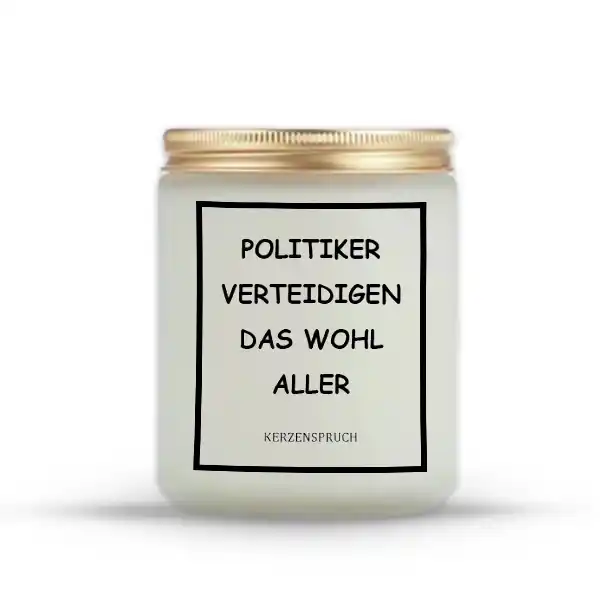 Der Spruch „POLITIKER VERTEIDIGEN DAS WOHL ALLER.“ ist ein zentraler Bestandteil dieser Kerze, da er uns immer wieder vor Augen führt, dass das Wohl der Gesellschaft in den Händen unserer Politiker liegt. Politische Entscheidungen sollten stets im Einklang mit dem Gemeinwohl getroffen werden – eine Wahrheit, die uns die „Politische Sprüche Kerzen“ bei jedem Anzünden ins Gedächtnis ruft.