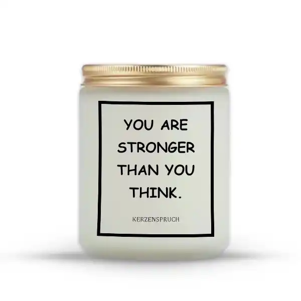Positive Kerzensprüche auf Englisch sind mehr als nur Worte auf einer Kerze – sie sind tägliche Erinnerungen daran, dass du stärker bist, als du manchmal glaubst. Die Kerze mit dem Spruch „YOU ARE STRONGER THAN YOU THINK.“ bringt dir genau diese Motivation direkt in dein Zuhause. Sie begleitet dich in Momenten, in denen du neue Kraft brauchst, und sorgt für eine Atmosphäre voller Zuversicht und Wärme.