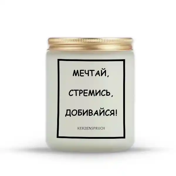 🕯️ Russische Kerzen Baden-Württemberg vereinen traditionelle russische Kultur mit moderner Handwerkskunst aus Deutschland. Wenn Sie eine besondere Kerze suchen, die nicht nur Licht spendet, sondern auch eine inspirierende Botschaft trägt, sind die Russischen Kerzen Baden-Württemberg genau passend. Die Kerze МЕЧТАЙ, СТРЕМИСЬ, ДОБИВАЙСЯ! („Träume, strebe, erreiche!“) motiviert und bringt positive Energie in Ihr Zuhause.