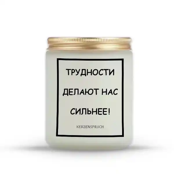🕯️ Russische Kerzen Bayern bringen Dir handgefertigte Duftkerzen direkt nach Hause, die nicht nur mit ihrem angenehmen Duft, sondern auch mit einer starken Botschaft überzeugen. Die Kerze ТРУДНОСТИ ДЕЛАЮТ НАС СИЛЬНЕЕ! („Schwierigkeiten machen uns stärker!“) ist perfekt, um Mut und Zuversicht in Deine Räume zu bringen.