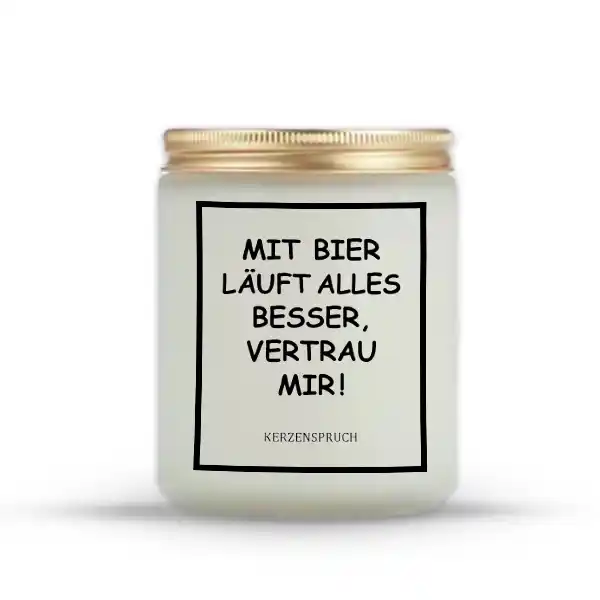 Der Spruch „MIT BIER LÄUFT ALLES BESSER, VERTRAU MIR!“ bringt Humor und Lebensfreude zusammen. Diese Kerze eignet sich hervorragend als Geschenk für Freunde, die gerne feiern, oder als Highlight für deine nächste Party zuhause.
