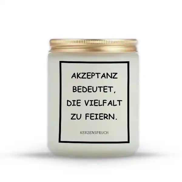 Hol dir jetzt die Sojawachs Kerzen Vielfalt feiern und lasse dich von ihrem Licht und der Botschaft inspirieren. Der Spruch „AKZEPTANZ BEDEUTET, DIE VIELFALT ZU FEIERN“ wird dich immer daran erinnern, wie wichtig es ist, alle Menschen und ihre unterschiedlichen Perspektiven zu respektieren. Bestelle jetzt und bringe mehr Liebe und Akzeptanz in dein Zuhause!